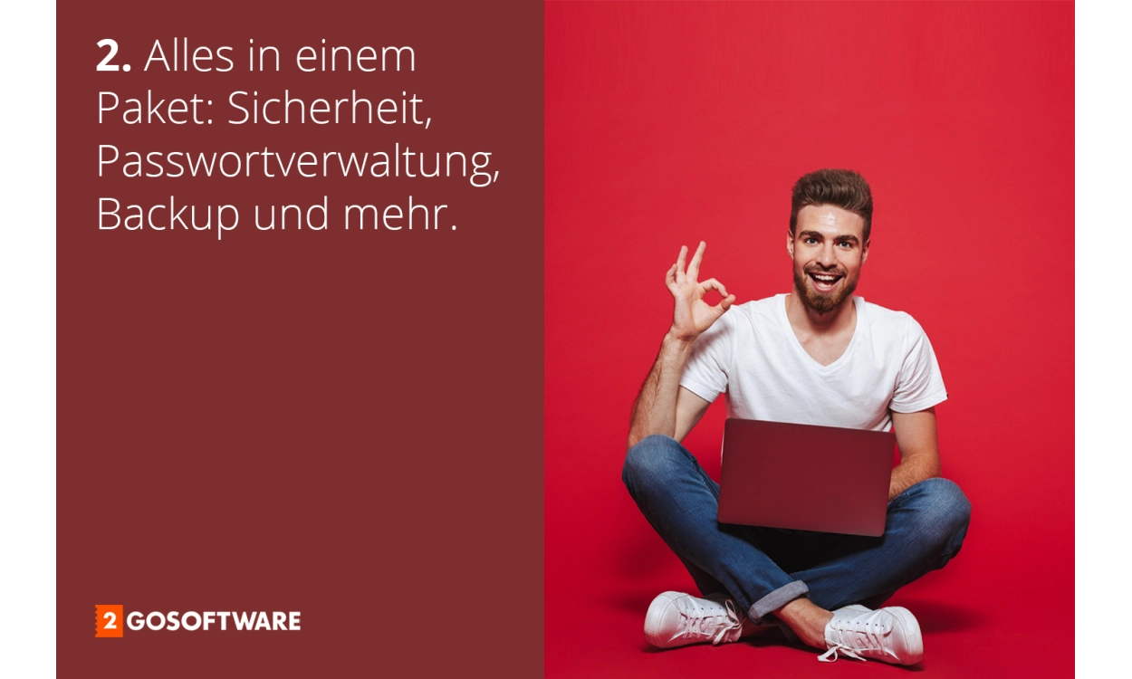 Die beste digitale Sicherheit, wir haben sie für Sie herausgesucht. Dual-Bundle mit integriertem Backup und Recovery, damit Sie im Notfall weiterarbeiten können. Außerdem bieten die Software-Spezialisten von 2GO Software Support; wir installieren, konfigurieren und begleiten Sie während Ihres Abonnements durch alle Aspekte Ihrer digitalen Sicherheit. Kurz gesagt: Alle Software die Sie brauchen; Maximale Sicherheit. Alles, damit Sie Ihr Online-Leben sorgenfrei genießen können.