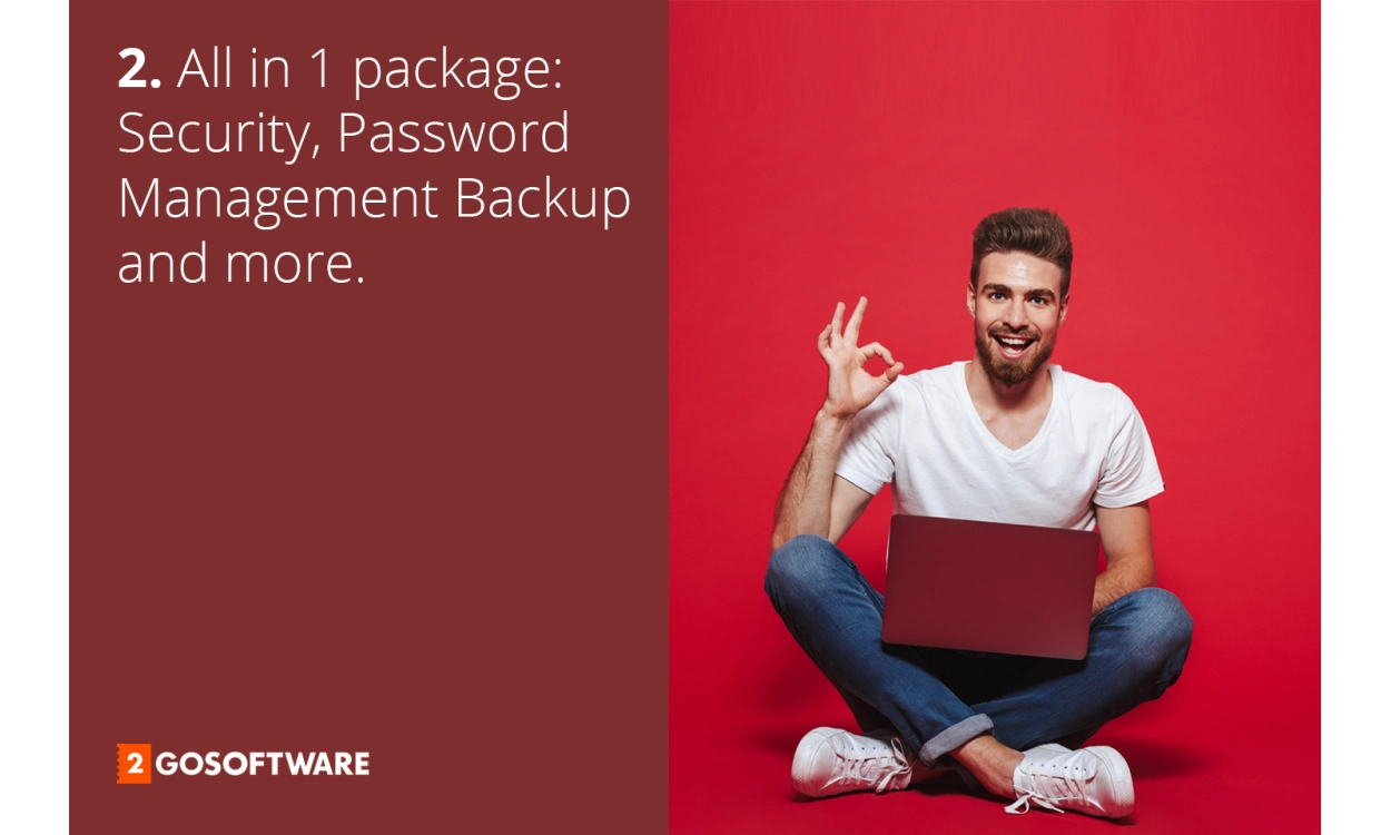 The best digital security, we've picked it out for you. Dual-bundle with backup and recovery built in so you can keep going in an emergency. Plus, 2GO Software's software specialists support you; we will install, configure and walk you through all aspects of your digital security during your subscription. In short: ALL the software you need; Maximum security. Everything so you can enjoy your online life without worry.