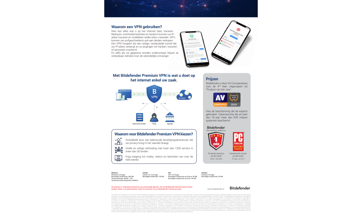 With the Bitdefender VPN your information will remain private even when you connect with an unsecured wireless network such as at airports, shopping malls, pubs or hotels. This way you'll prevent unwanted situation such as theft or personal information or attempt to access the IP address of your computer. You also get access to protected content, regardless of the country. The VPN connection functions as a tunnel between your device and the network you're connected with, the VPN secures the connection by encrypting all information and by hiding your IP address wherever you are. Your online traffic will be redirected via another server making it virtually impossible to identify your device. In short; safe and anonymous browsing on the Web.
