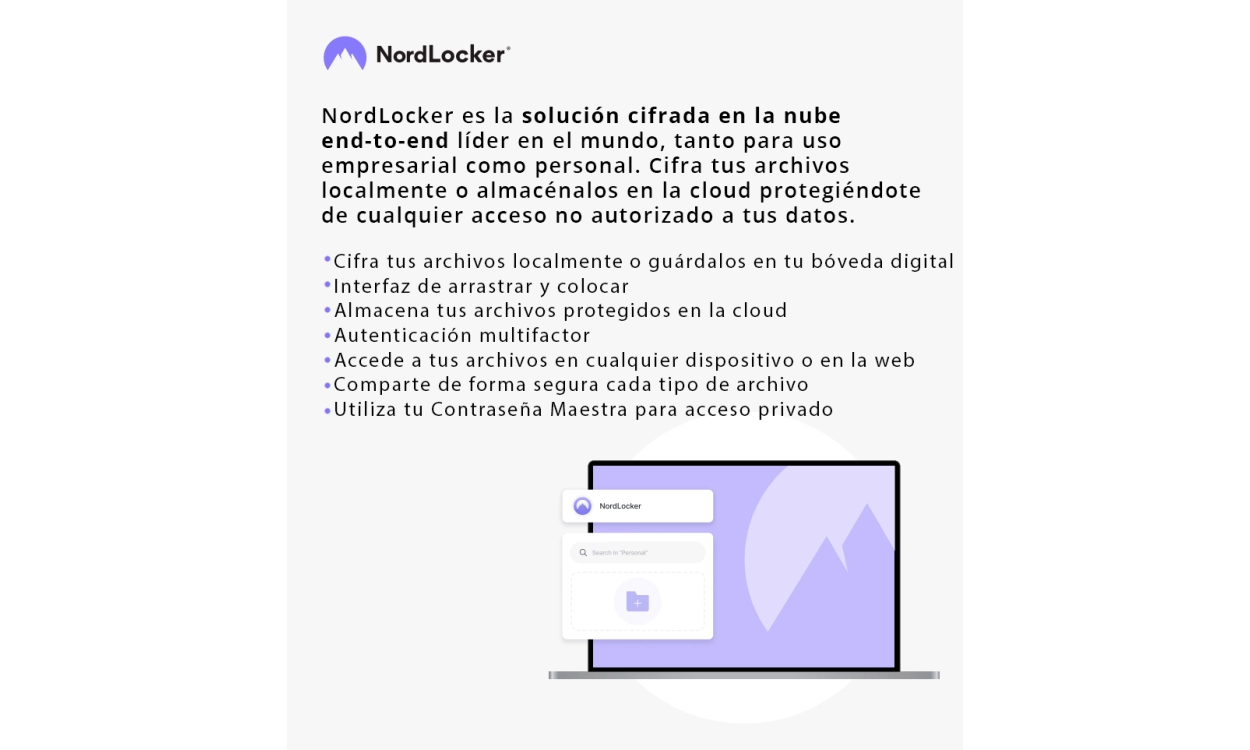 Por supuesto, querrá saber qué más incluye esta suscripción Completo. Eso es NordLocker. Esto es 1 TB de almacenamiento en cloud encriptadodonde podrá guardar todos sus archivos en un entorno seguro y acceder a ellos siempre de forma remota. Ya sea desde su ordenador privado o desde un ordenador público, siempre podrá acceder a ellos de forma segura y sin preocupaciones. ¿Compartir un archivo? No hay problema. Puede enviar enlaces encriptados con un código único a quien desee. Si su portátil u ordenador se estropea o lo pierde, al menos sus archivos no se perderán. NordLocker realiza copias de seguridad automáticas de sus archivos.