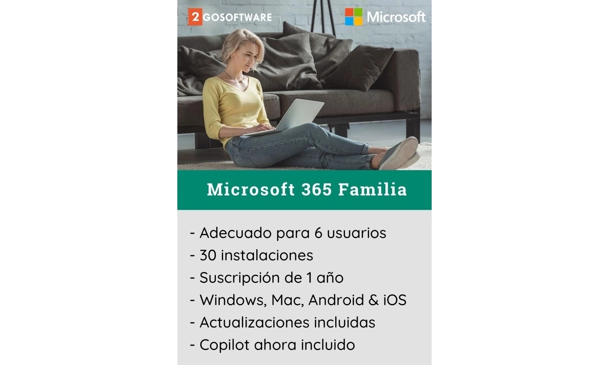 Microsoft 365 Familia da acceso a hasta 6 usuarios a los programas de Office más populares, como Word, Excel, PowerPoint, Outlook, y OneNote. Cada usuario obtiene 1 TB de almacenamiento en la nube en OneDrive y puede instalar el software en hasta 5 dispositivos de Windows, Mac, iOS o Android. Los usuarios de Windows también pueden utilizar Access y Publisher.