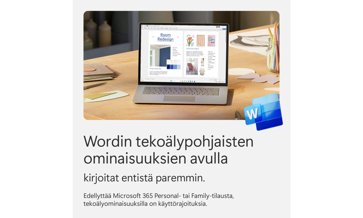 Copilot Microsoft 365:ssä helpottaa työskentelyäsi. Täydellinen tehtäviin kuten kirjoittamiseen, tiivistämiseen ja Microsoft 365 -ohjelmien käyttöavustukseen. Enemmän mukavuutta, vähemmän hukattua aikaa! Voit nyt myös käyttää Copilotia Microsoft 365 Personal ja Family -versioissa!