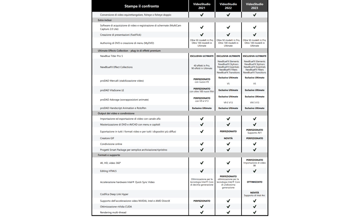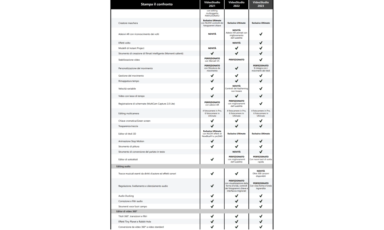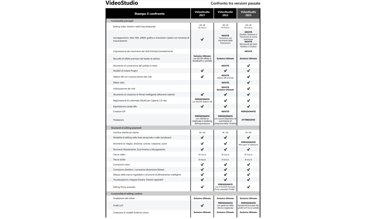 VideoStudio è ampiamente riconosciuto per essere divertente, ricco di funzioni e facile da usare, consentendovi di immergervi nell'editing e di sorprendere voi stessi con ciò che potete creare. Sfruttate gli esclusivi extra creativi e le potenti funzioni di VideoStudio Ultimate 2023 per portare i vostri progetti a un livello superiore. Sfruttate più di 2.000 effetti unici e personalizzabili, filtri e nuove sovrapposizioni, oppure evocate la drammaticità della vostra narrazione con effetti di movimento e titoli dinamici di grande impatto. Aggiungete divertimento con gli adesivi AR di tendenza e semplificate la vostra esperienza di editing con i nuovi modelli di progetto istantanei. Sfruttate gli strumenti esclusivi per creare maschere e transizioni video personalizzate, applicare regolazioni della gradazione del colore o mostrare più video contemporaneamente con video dinamici a schermo diviso: sono solo alcune delle caratteristiche che rendono Ultimate un prodotto di spicco. VideoStudio Ultimate 2023 ha tutto ciò che serve per andare oltre le correzioni video di base e ottenere risultati di alta qualità. C'è qualcosa per ogni editor video, sia che siate alle prime armi sia che facciate editing da anni!