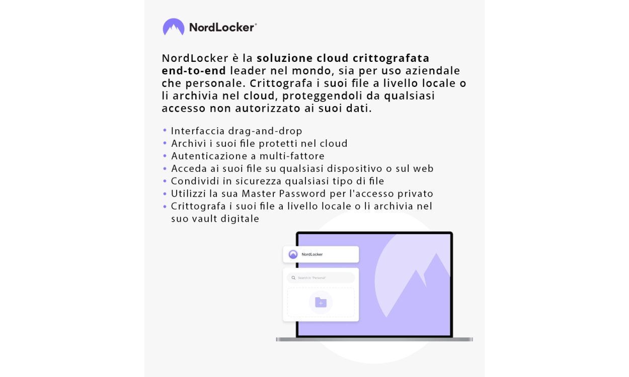Naturalmente, vuole sapere cos'altro è incluso in questo abbonamento Complete. Si tratta di NordLocker. Questo sono 1 TB di cloud storage criptato dove può conservare tutti i suoi file in un ambiente sicuro e accedervi sempre da remoto. Che sia dal suo computer privato o da un computer pubblico, potrà sempre accedervi in modo sicuro e senza preoccupazioni. Condividere un file? Nessun problema. Può inviare link criptati con un codice unico a chiunque desideri. Se il suo laptop o computer si rompe o lo perde, almeno i suoi file non andranno persi. NordLocker esegue automaticamente il backup dei suoi file.
