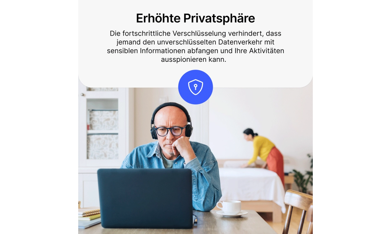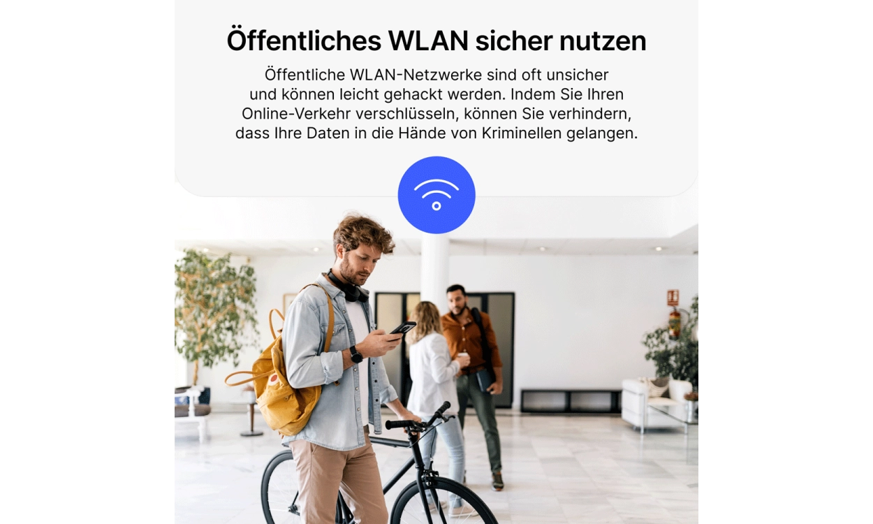 • Schütze deine Verbindung im WLAN: Öffentliche WLAN-Netzwerke können gefährlich sein, aber NordVPN Basis verschlüsselt deinen Internetverkehr, selbst in unsicheren Netzwerken in Cafés oder Flughäfen, sodass du vor Hackern geschützt bleibst.